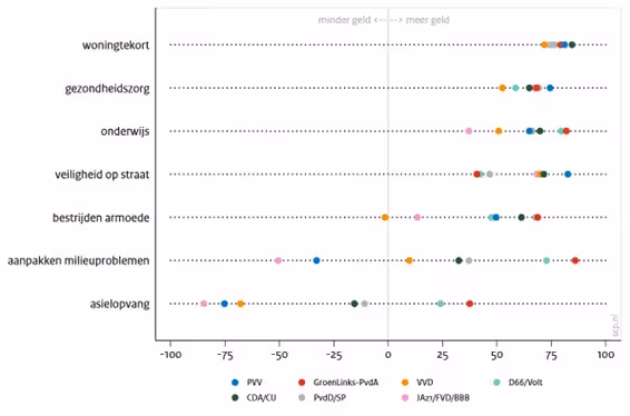 De meeste mensen vinden dat een nieuw kabinet meer geld moet uitgeven aan gezondheidszorg, onderwijs en veiligheid. Over uitgaven aan klimaat en asiel zijn de meningen verdeeld. Aanhangers van GroenLinks-PvdA en D66/Volt willen meer geld naar de aanpak van milieu­problemen. Kiezers van JA21/FVD/BBB en PVV willen daar minder geld heen. Ook willen zij – net als aanhangers van de VVD – minder geld besteden aan de asielopvang.